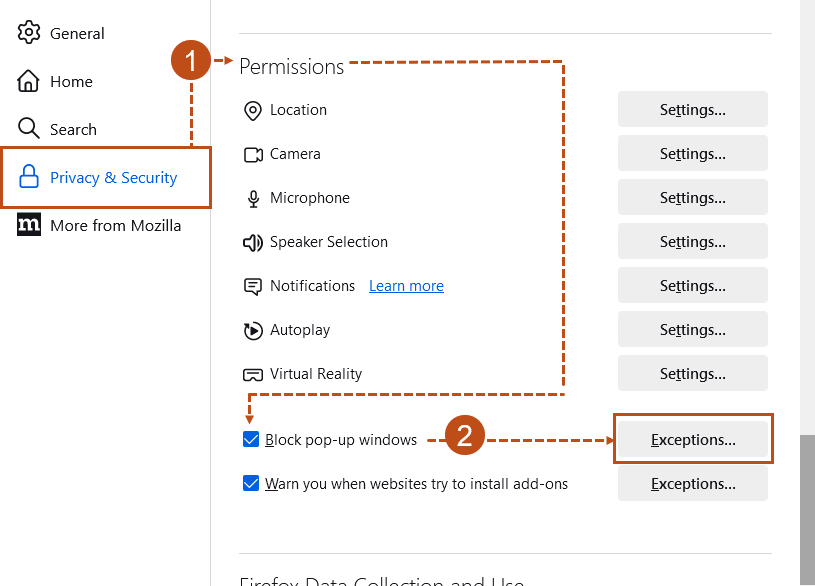 Configure pop-up blocker settings in Mozilla Firefox